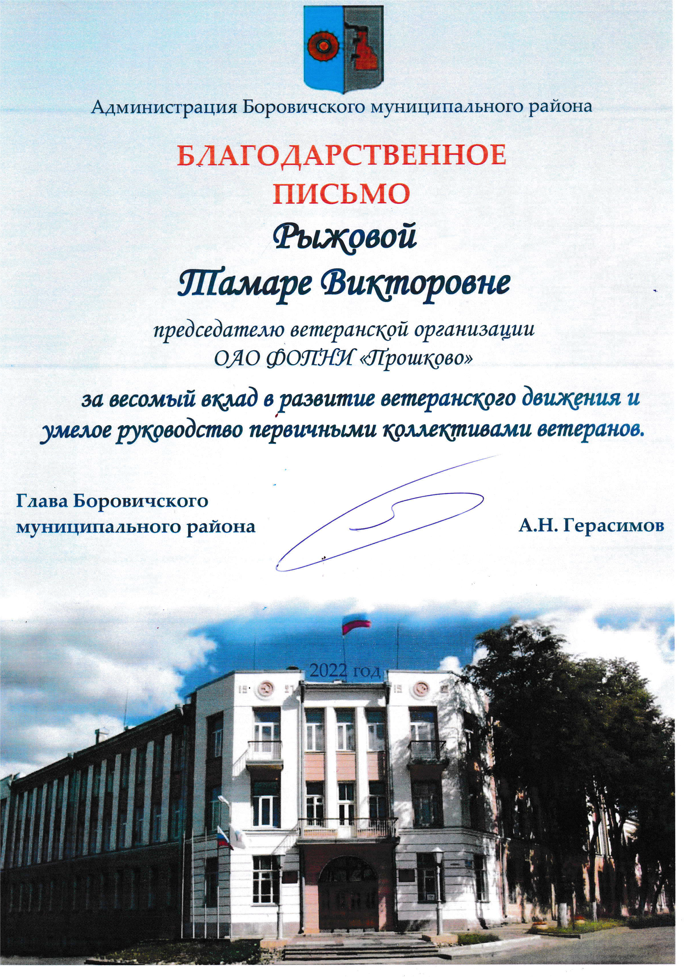 Далее обсудили вопросы организации социальной защиты граждан пожилого возраста и поддержания их жизненного уровня в настоящее время, подвели итоги социально-экономического развития Боровичского муниципального района за 2021 год и наградили активистов ветеранского движения. Одной из награжденных была Рыжова Тамара Викторовна, председатель нашей Ветеранской организации. Ее наградили Благодарственным письмом за весомый вклад в развитие ветеранского движения и умелое руководство первичными коллективами ветеранов.