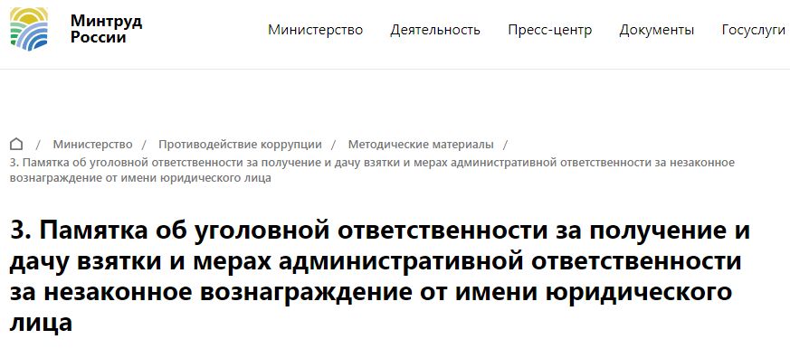 Памятка об уголовной ответственности за получение и дачу взятки и мерах административной ответственности за незаконное вознаграждение от имени юридического лица